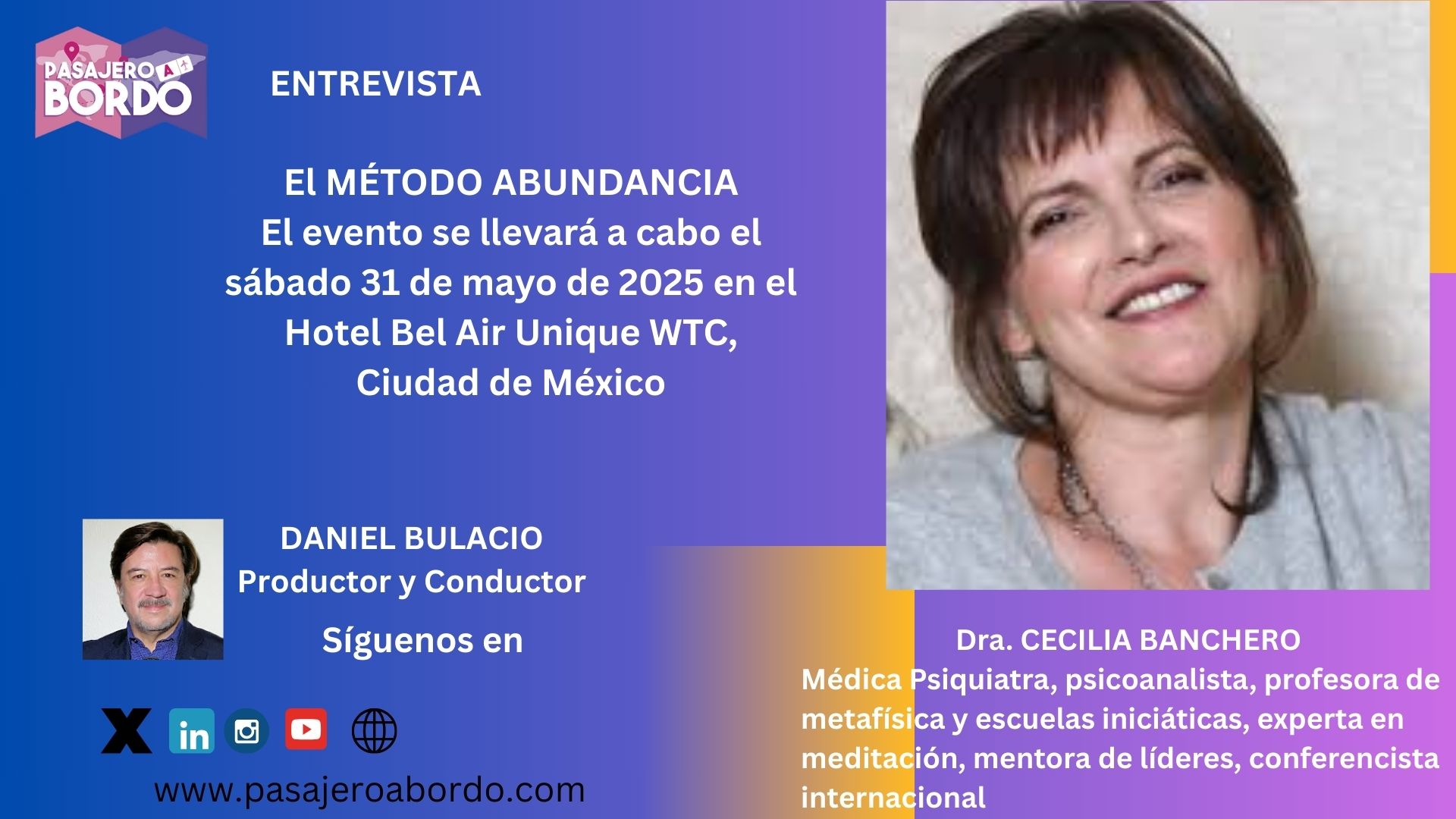 En el nuevo episodio de Pasajero a Bordo, tuvimos el honor de conversar con la Dra. Cecilia Banchero, médica psiquiatra, psicoanalista, mentora de líderes y experta en conocimientos iniciáticos, sobre su próxima presentación en México del Seminario Inmersivo: Método Abundancia. Durante la charla, profundizamos en cómo generar una estructura de pensamiento que nos conecte con la abundancia, el progreso y el desarrollo de nuestros proyectos personales y profesionales. La Dra. Banchero explicó cómo es posible reprogramar creencias limitantes y cambiar patrones internos a través de herramientas prácticas que integran ciencia, espiritualidad, meditación y técnicas ancestrales. Hablamos también de las resistencias internas al cambio, de la importancia del autoconocimiento, y de cómo entrenar nuestra mente y energía para manifestar una vida más plena y coherente con nuestro propósito. Una entrevista reveladora, inspiradora y cargada de contenido útil para quienes buscan transformar su vida desde adentro hacia afuera. No te la pierdas.