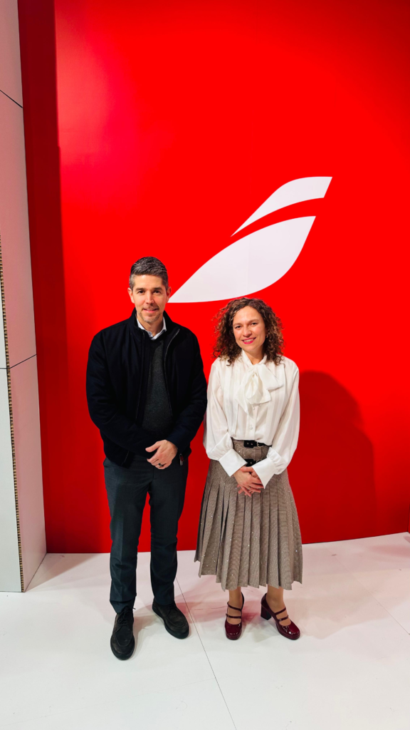 Celia Muñoz Espin, Directora de Alianzas, Distribución y Estrategia Comercial de IBERIA y Javier Suárez, VP de Alianzas, Estrategia y Planeación de VIVA, intercambiando aviones como símbolo del fortalecimiento,