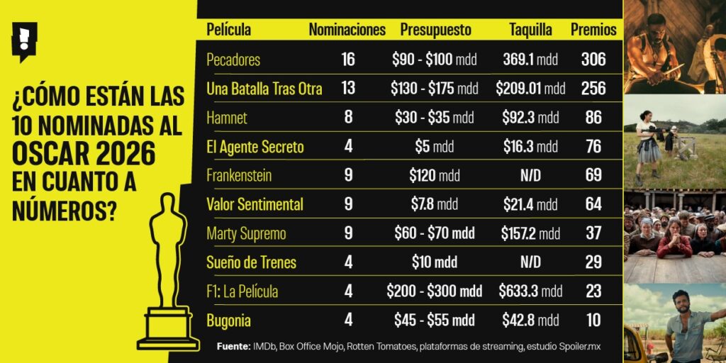 - «Pecadores» lidera en prácticamente todos los rubros: 16 nominaciones, 299 premios y 369.1 millones de dólares en taquilla la colocan como la rival a vencer, de acuerdo a Spoiler.mx